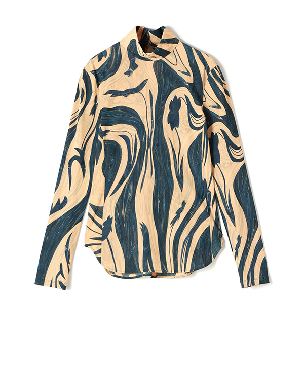 Mame Kurogouchi(マメ クロゴウチ)のトップス。初期伊万里の陶器に描かれた、日本の山水や花鳥の風景をジャカードで表現したハイネックニットです。 透け感のある繊細な編み地が肌をセンシュアルに演出してくれ、柄に濃淡をつけることで奥行きと深みのある表情に。フィット感がありコンパクトな身頃は上半身を華奢にみせ、すっきりとしたシルエットが身体を美しくみせながら、軽やかな着用感を叶える1着に仕上げられています。