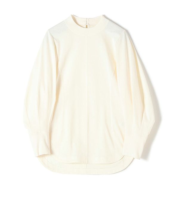 Mame Kurogouchi(マメ クロゴウチ)のコットンジャージートップ。 毛羽立ちを抑える紡績綿を使用することで落ち着いた印象を与え、リラクシングな軽い着心地が日常のあらゆるシーンに溶け込みます。カジュアルな素材ながら立体的なカッティングはメリハリのあるシルエットを作り出し、コンパクトな身頃とたっぷりとボリュームのある袖が幅広いスタイリングに活躍してくれます。