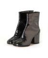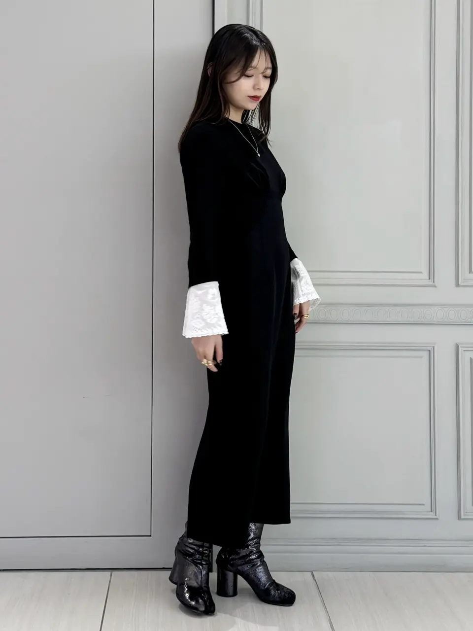 裾スリットと高めウエストで縦ラインを強調。袖のレースカフスは取り外し可能で、手元を美しく魅せます。ゆったりシルエットながらスタイルアップ効果も。Maison Margielaのガンメタリック タビブーツと合わせれば、洗練されたモードスタイルに。