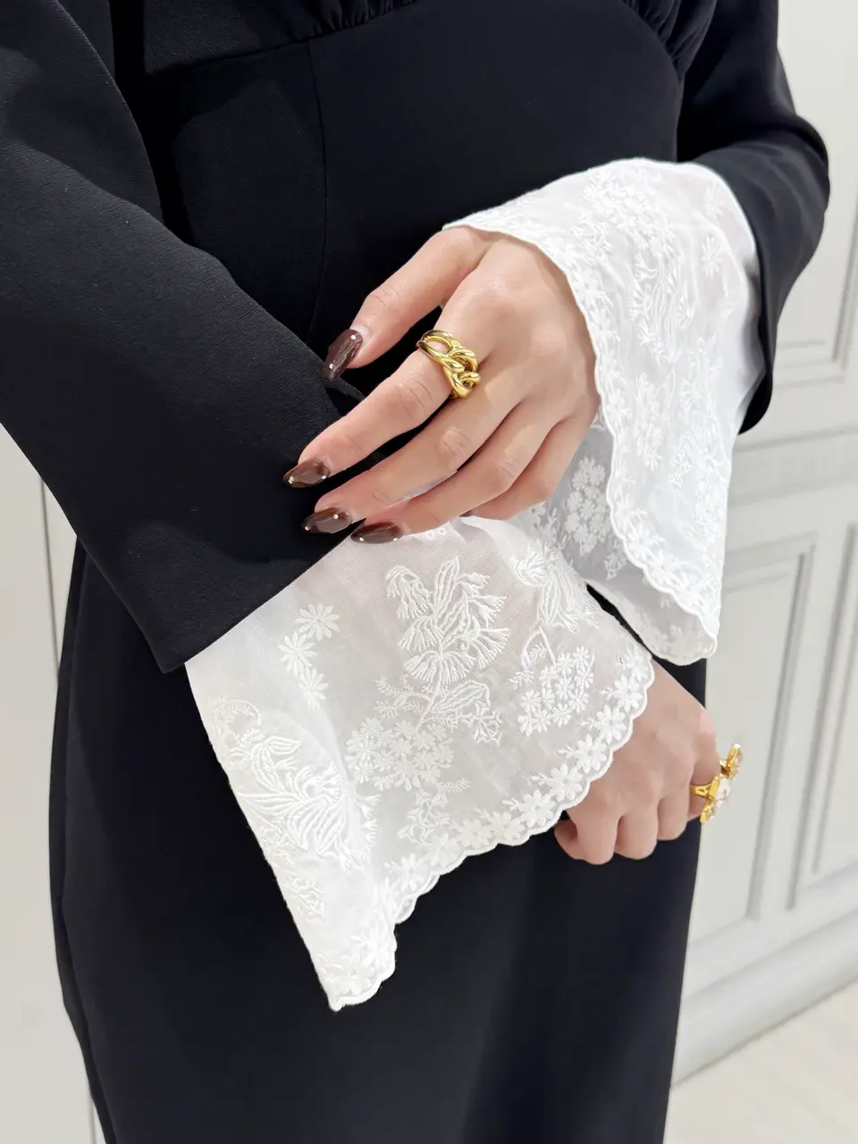 手刺繍風のシフォン刺繍を袖、カフス、襟に贅沢にあしらい、立体感と華やかさを演出した一着。