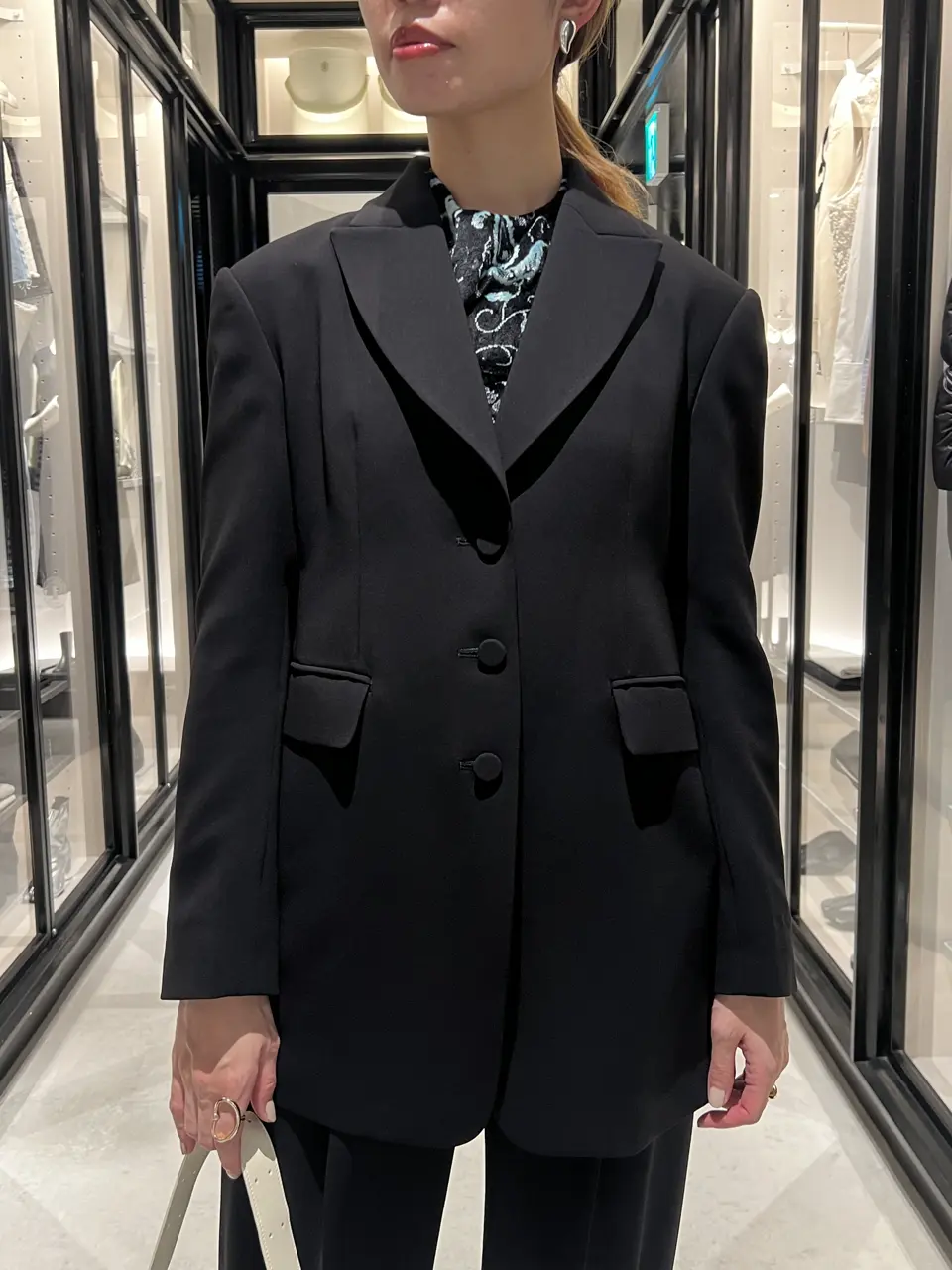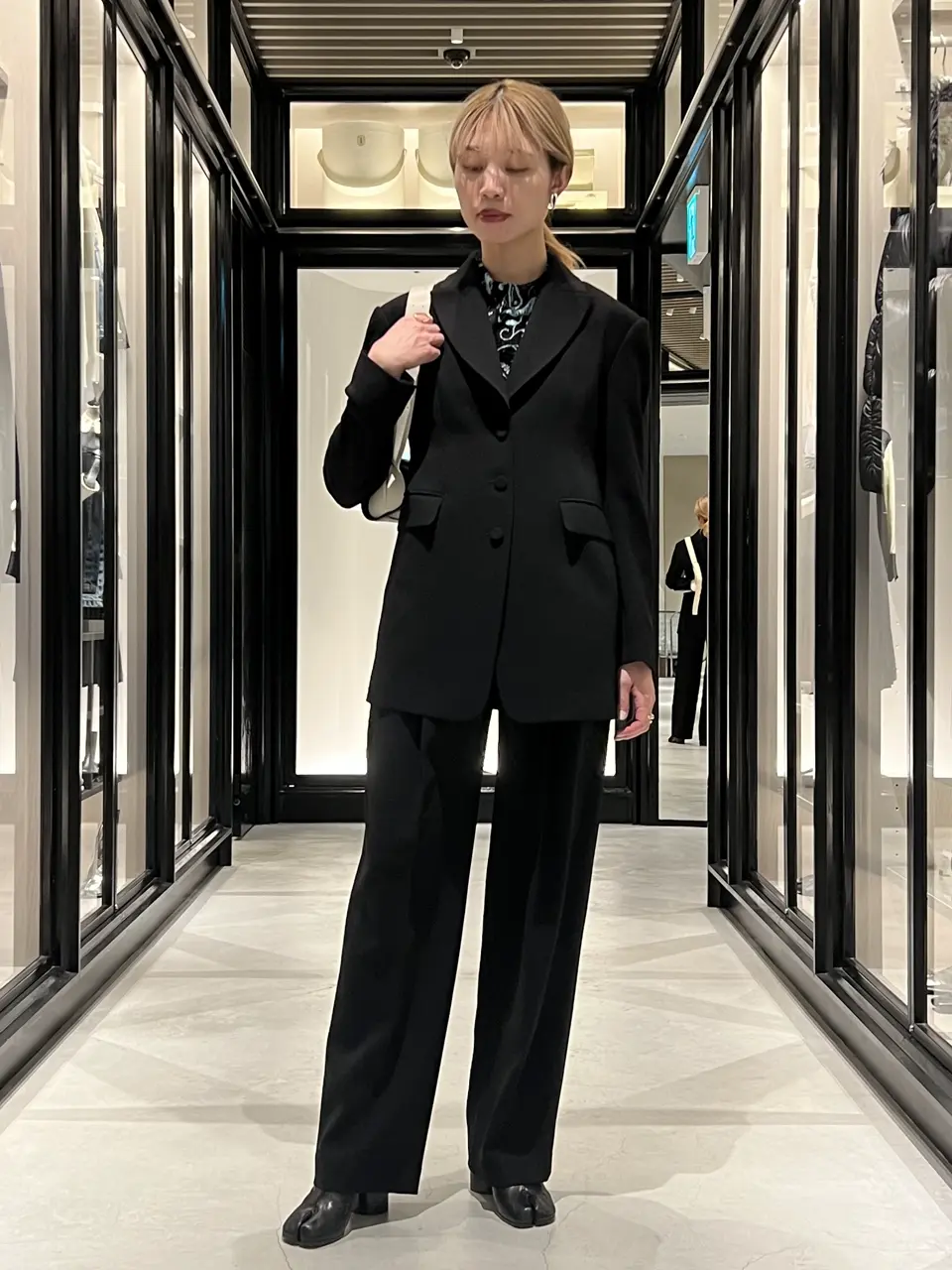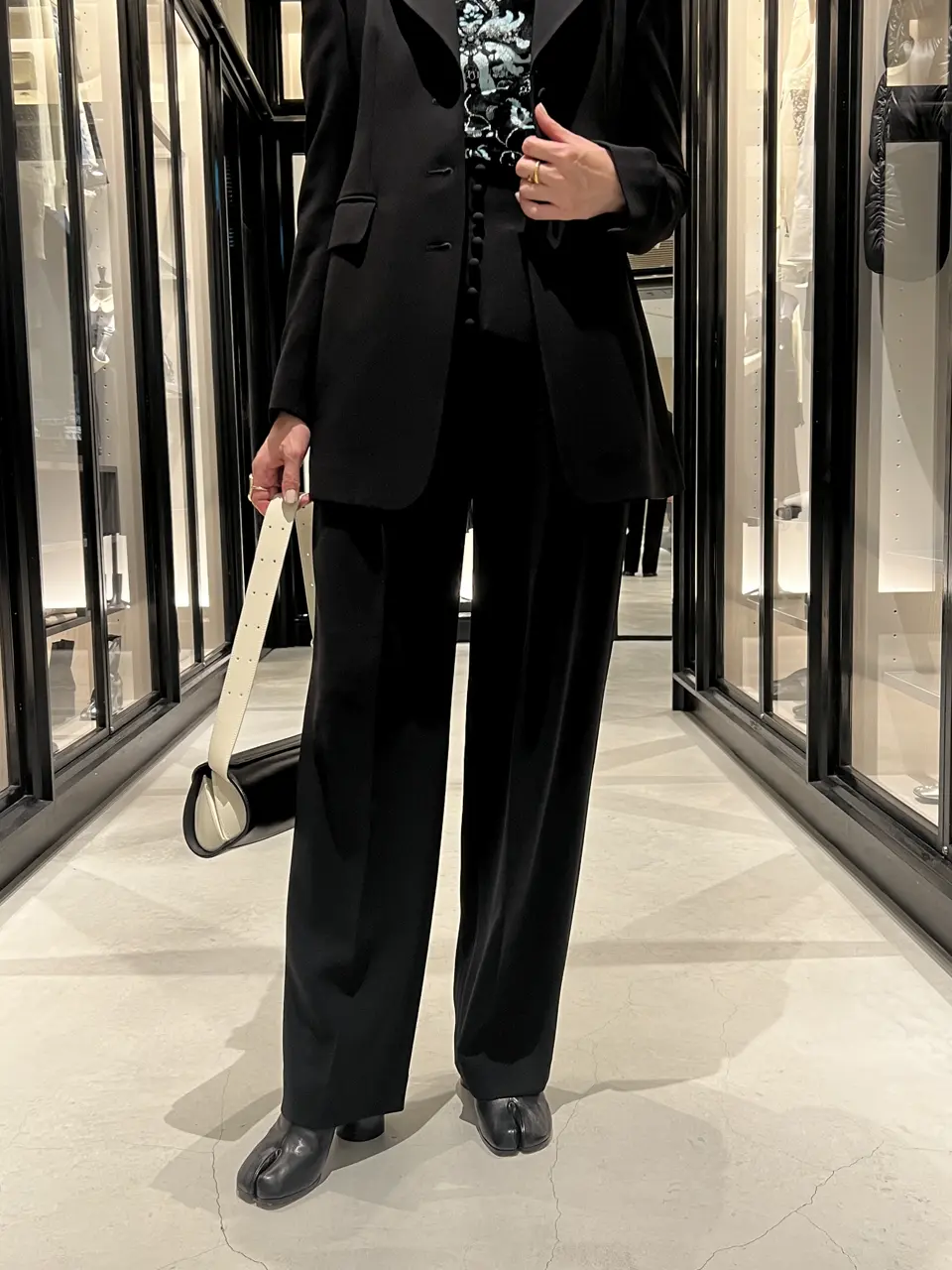 パンツとジャケットを組み合わせたスタイル。Mame Kurogouchiの洗練されたジャケットにパンツを合わせ、インナーには華やかなグリーンをプラスして引き立てます。