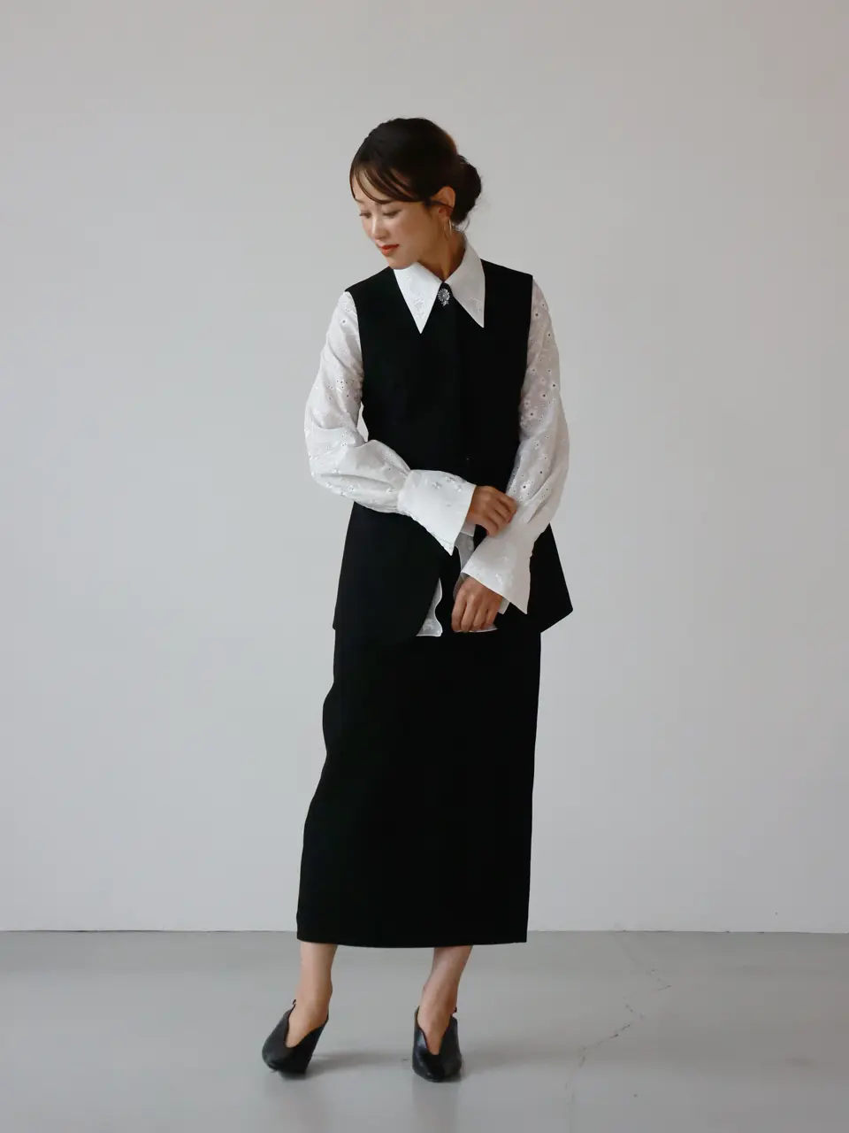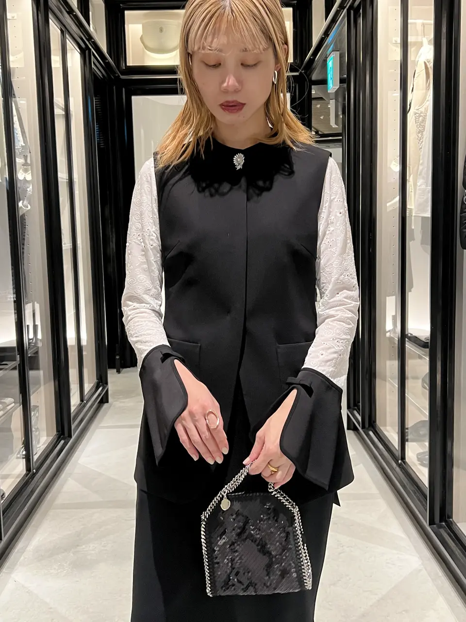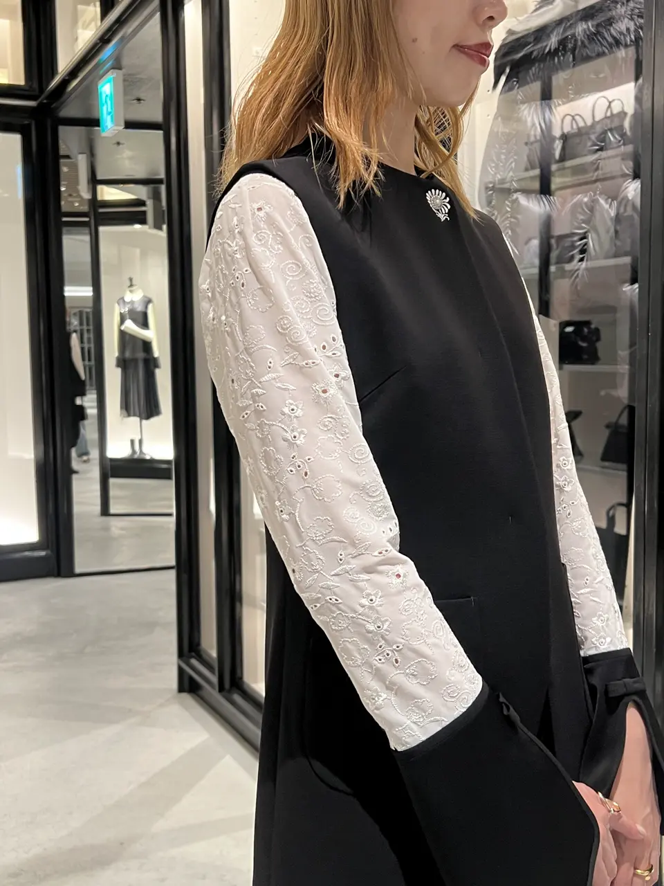袖に贅沢なフローラル刺繍が施されたジョーゼット素材のワンピースに、上品なベストを重ねたスタイリングです。ベストのややタイトなウエストラインで自然なくびれを演出。上品にまとまる万能コーデに、モードな小物をプラスして仕上げました。