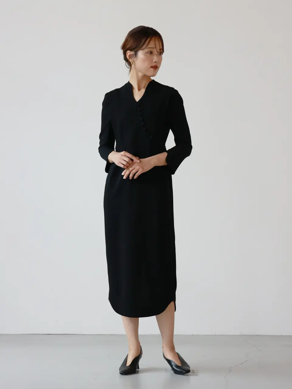 カーブネックとくるみボタンがブランドらしいシグネチャーデザイン。身体に沿うシルエットと落ち着いたカラーで洗練された印象に。