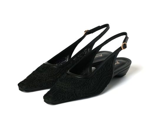 曲線カットが印象的なコード刺繍ヒールパンプス。コンパクトなつま先には、初期伊万里の絵付け模様をモチーフにした刺繍が施され、透け感のあるデザインが足元をセンシュアルに演出します。アイコニックながらプレーンなローヒール(2.5cm)は、どんなスタイルにも合わせやすく、上品さをプラスします。