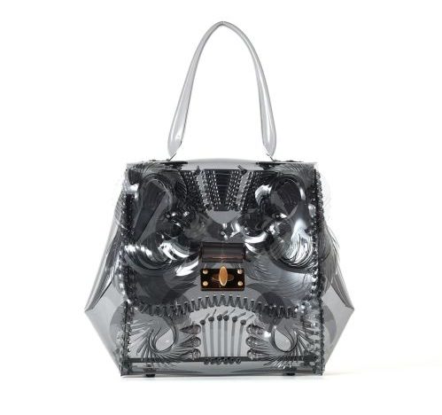 PVCを使用したアイコニックなハンドバッグ。ブランド創設時から続くシグネチャーシリーズで、工業用素材であるPVCの美しさに、デザイナーが幼少期に見た冬景色を重ね合わせて生まれました。立体的なモチーフは氷柱のような繊細さをまとい、職人の手作業で組み立てられています。重厚感のあるフォルムと華やかな金具が、日常のスタイルを上品に格上げ。ブランドロゴ入りボックスも付属します。