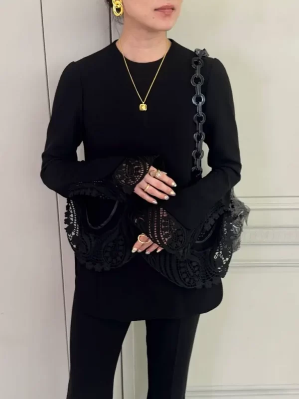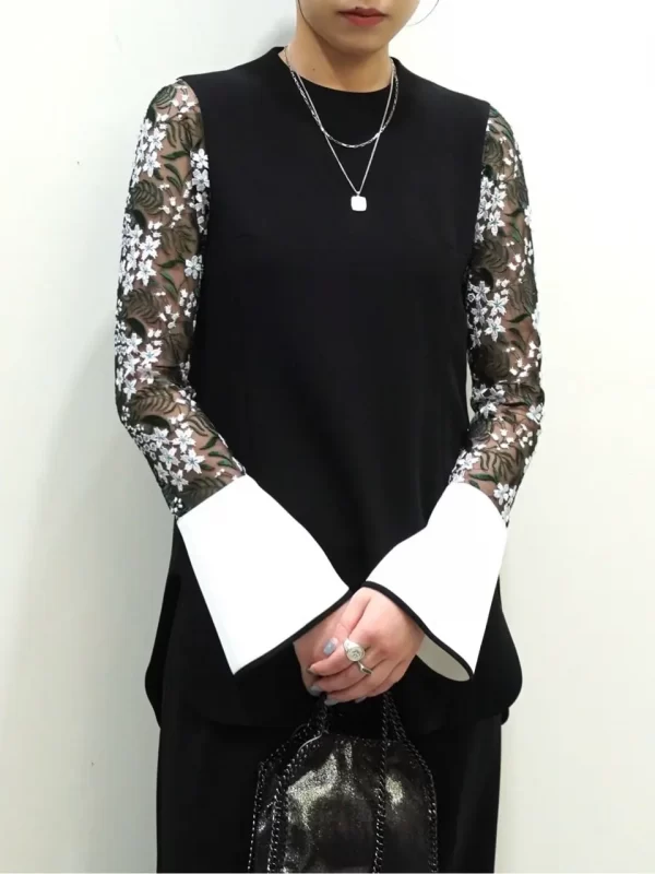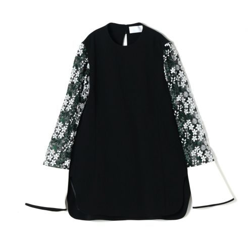 花柄レースのスリーブが印象的なチュールトップス。シワになりにくい素材と程よい透け感で腕を華奢に見せ、長めの着丈が腰まわりをカバー。デイリーからオケージョンまで活躍する、マメ クロゴウチらしいセンシュアルな一着です。