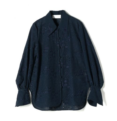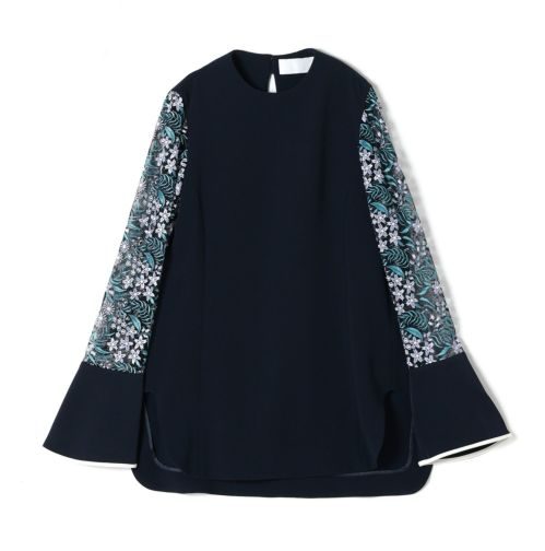 NAVYカラーの花柄レーススリーブが目を引くチュールトップス。アップデートされたシグネチャーデザインは、フレア袖と程よい透け感で動きのある印象を演出します。長めの着丈で腰まわりをカバーしつつ、シワになりにくい素材を使用しているため、幅広く着こなせる一着です。