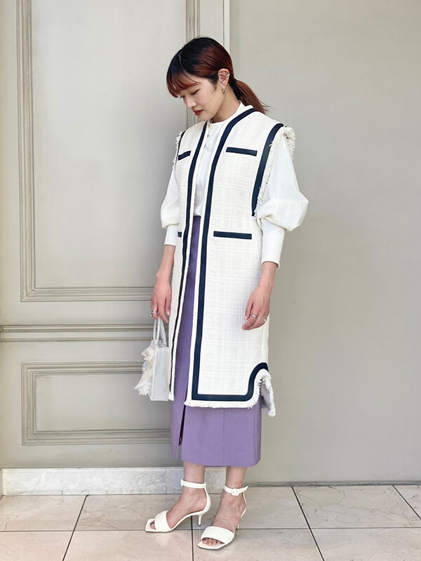 エレガントなツイード素材にブラックのパイピングがなんとも新鮮でマメならではのデザイン。