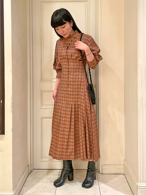 後ろ姿もタックで美しく仕立てられています。チェック柄が浮かび上がるようで幻想的です…!是非実物を見て頂きたいです。