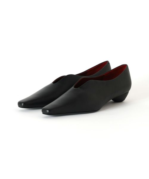 Mame Kurogouchi(マメクロゴウチ)のローヒールパンプス。ブランドのシグネチャーでもあるドレスの胸元を彷彿とさせるカッティングデザインを施したエレガントなフロントシームが女性らしさを高めてくれる一足です。アイコニックながらもプレーンで、低めのヒールを採用したデザインは、どんなスタイリングにも合いやすくの日常からオケージョンシーンまで幅広く活躍してくれること間違いなしです。