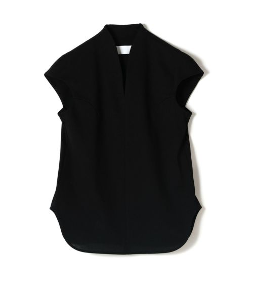 Mame Kurogouchi(マメクロゴウチ)の上品な光沢が印象的なスリーブレストップス。柔らかなカーブを描いたフレンチスリーブとVネックが特徴的なトップスは、カジュアルな素材ながらも構築的なフォルムがすっきりと上品な印象を保ってくれます。程よくリラクシーなムードを持った一枚は日常のあらゆるシーンに溶け込みます。