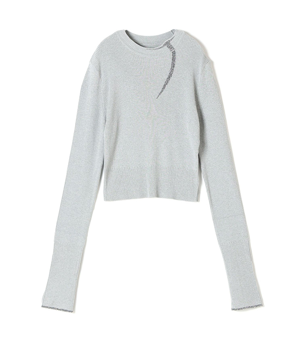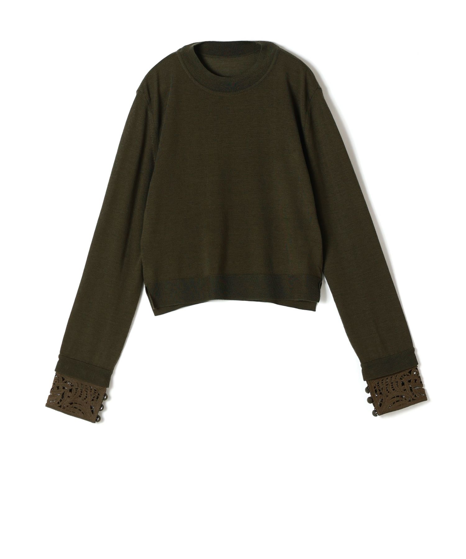Mame Kurogouchi(マメ クロゴウチ)のニット。コンパクトな着丈が印象的でクラシカルなニットトップです。 すっきりとしたシルエットにボタニカルな刺繍をデザインしたカフスが着こなしのアクセントに。カフスの刺繍は取り外すことができ、シンプルなクルーネックニットとしての着こなしも可能。コンパクトで落ち着いたトーンはレイヤードしやすく、ドレスやハイウエストのボトムとあわせることで、幅広いスタイルにフィットする1着に仕上げられました。