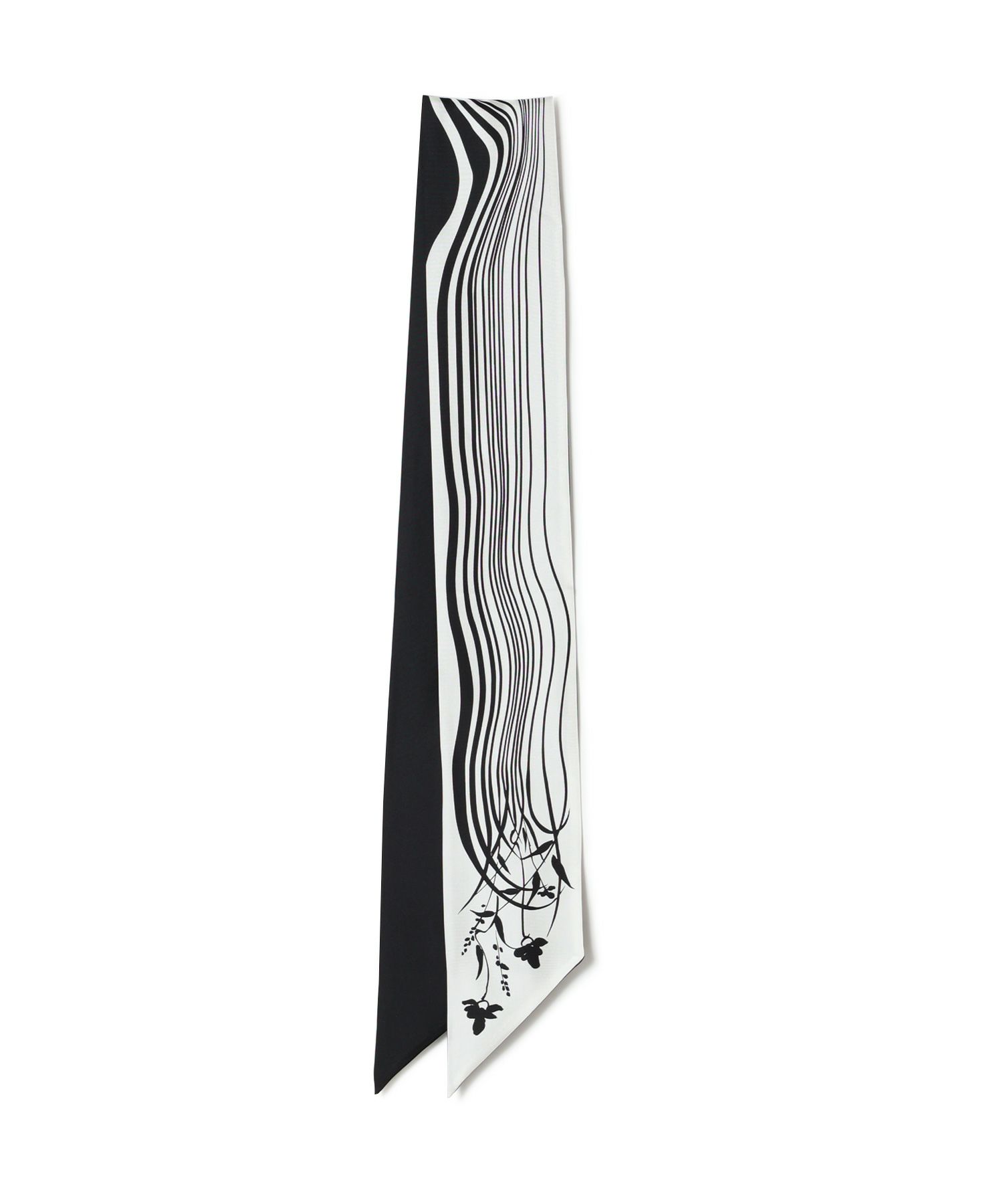 Mame Kurogouchi(マメ クロゴウチ)のスカーフ。唐津焼の絵付を思わせるオリジナルの植物柄を、繊細なタッチで表現したシルクスカーフです。 手捺染の技法でプリントを繰り返し、スカーフに直接的に絵付けした様な風合いが美しい。横長の大判な作りにすることで頭や首元に巻くことはもちろん、腰元や鞄を飾ることも可能で、様々なシーンで活躍が可能。表面と裏面のデザイン変えることで、日常に取り入れやすいスカーフは、シルクの光沢感がやわらかな印象を与えながらも、いつもの装いを上品にアップデートさせる1点です。