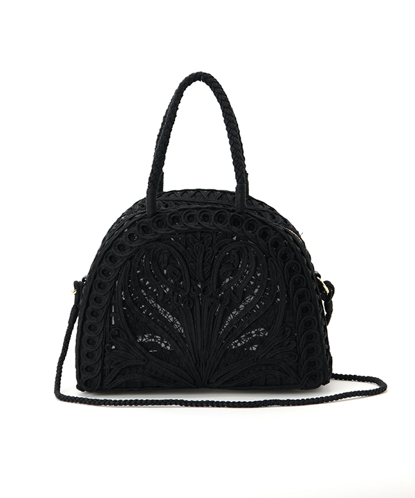 Mame Kurogouchi(マメ クロゴウチ)コード刺繍のテクニックを用いたアイコニックな半月型バッグ。オリジナルのリネンコードを一筆書きの要領で柄を組みながら刺繍していくことで、日本の伝統的な籠モチーフや植物からインスパイ アされた複雑な編み模様を見事に表現。ハリのあるチュールにコード刺繍を施すことで、しっかりとした形状を実現しています。持ち手とショルダー紐はそれぞれ手で編まれており、ショルダー紐は取り外しが可能。 ボストン型のクラシックさと、ハンドの温かみを感じられるバッグです。