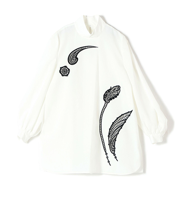 繊細なチュールレースが全面に施されたこの一枚は、古唐津の風景や記憶を思わせるグラフィックで今季のテーマを表現しています。ダーツや切り替えを極力省き、贅沢な刺繍が際立つデザインに仕上がっており、袖口がふんわりとフレアすることで動作が美しく引き立ちます。軽く羽織るだけでも華やかな印象を与え、また、インナーとのレイヤードスタイルでカジュアルからエレガントなスタイルまで幅広く活躍します。