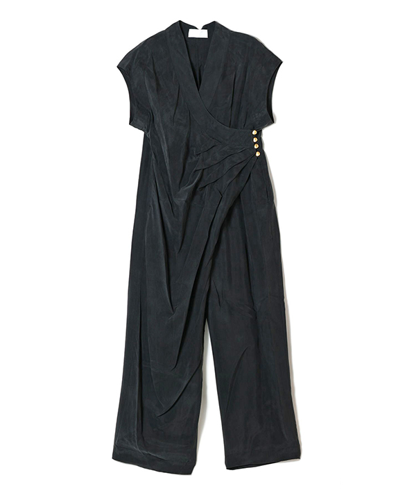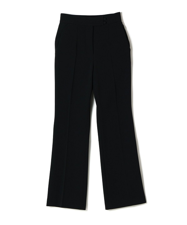 落ち感の美しいセンタープリーツと、ゆったりとしたシルエットが特徴で、美しい曲線を描くポケットデザインが印象的です。裾に向かってやや広がるラインは脚を長く見せ、ドレッシーさを演出します。セットアップでの着用も楽しめる1着です。