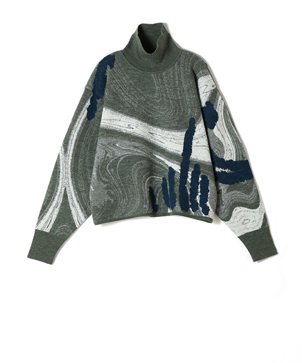 Mame Kurogouchi(マメ クロゴウチ)のニット。釉薬が混じりあう様なマーブル柄が印象的なハイネックニットトップです。 マーブル模様の中には絵唐津の鉄絵の様な模様を手書き風に再現。1着で1つの模様になるよう、前後の身頃と袖を全て異なる柄で編み立てられています。器を着ているかの様な柄表現が特徴的なニットは、スタイリングしやすい着丈に設計され、スカートとのセットアップスタイルだけでなく、様々なボトムスとの組み合わせも相性が良いアイテム。装いに華やぎを与える1着に仕上げられました。