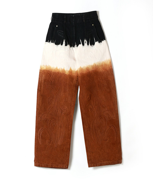 Mame Kurogouchi(マメ クロゴウチ)のワイドなデニムパンツ。 唐津焼の表面のような釉薬の混じり合いを表現するために、脱色、絞り、染色と様々な加工を施し、ムラのあるグラデーションに仕上げたワイドジーンズは、ハイウエストから裾に向かってU字のようにカーブしたシルエットが美しく、腰から裾まで贅沢にあしらわれた草花のエンボス加工がカジュアルなファブリックに華やぎをプラスしています。ポケット口は流れるようなカーブを描き、ポケットに手を入れた時にも手の甲にカーブラインが優しく沿うデザイン。細やかな柄とディテールが、立体感と気品漂うエレガントな着こなしを可能にする1着です。