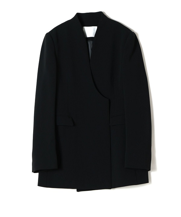緩やかにカーブするネックラインが印象的なノーカラーダブルジャケットです。膨らみのあるトリアセテート糸とポリエステルを混合した生地を使用し、ストレッチ性とシワになりにくいイージーケアを実現しました。ミニマルなノーカラーデザインと繊細なカッティングが洗練された上品なスタイルを演出し、セットアップでの着用もおすすめの一着です。アイコニックなスーツスタイルでフォーマルからデイリーまで幅広く活躍します。