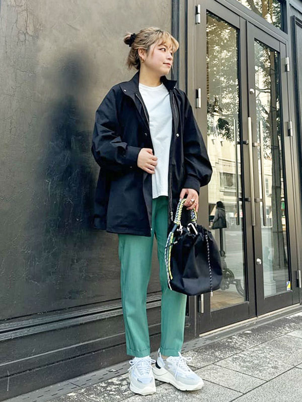 新色のグリーンはホワイトアイテムと合わせてクリーンな色合いのコーディネートに。