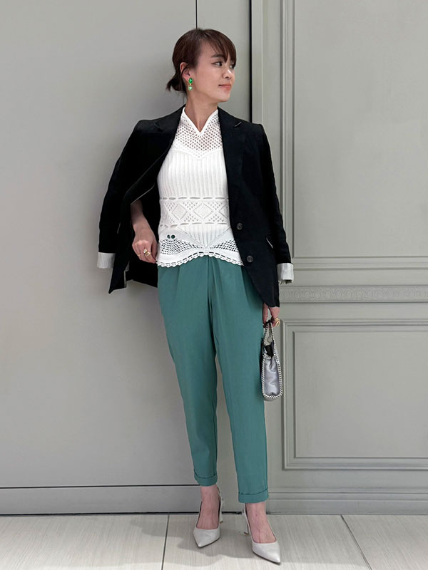 パンツ以外は白黒などベーシックカラーでまとめて、グリーンを主役に!上品な光沢感のある生地はきちんと感もあり、フォーマルな場にもぴったりです♪
