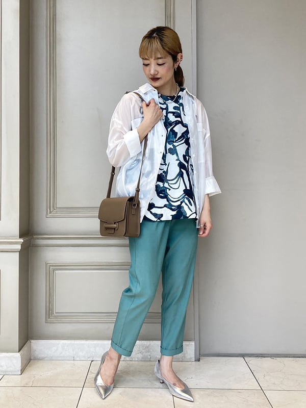 春らしさを感じさせてくれる淡くて柔らかい新色のグリーンに、サクラの柄ブラウスと爽やかなホワイトのシアーシャツを合わせて。シルバーのパンプスでトレンド感も意識したキレイめカジュアルスタイルに!