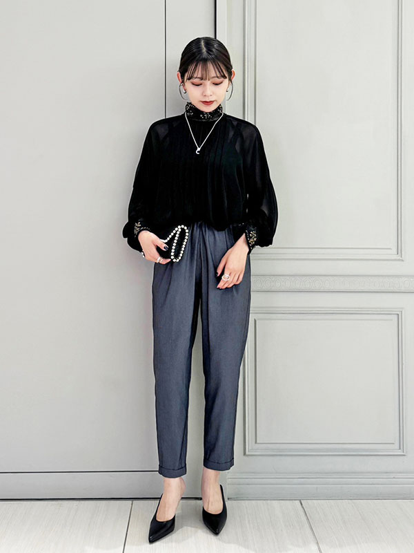 ■定番のブラウスも黒ではなくチャコールを合わせることで新鮮に。