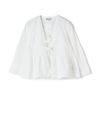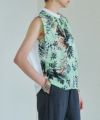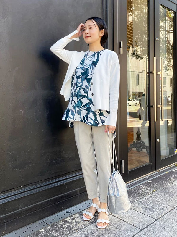 ■フレッシュな柄ブラウスにホワイトのショート丈カーデでバランスとトレンド感を両立