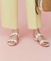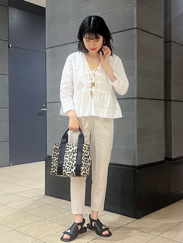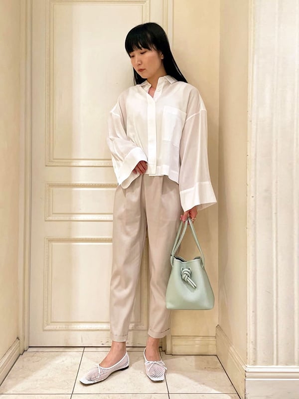 こんなときは綺麗さと優しげな雰囲気を両立させたコーディネートが鉄板。ホワイトの淡いトーンサンダルとエクリュパンツでおしゃれを満喫!フレッシュなグリーンのブラウスを選んで今らしく更新を。