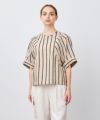 全身ベージュで綺麗目テーパードパンツフェミニンに。エクリュカラーのパンツに、ストライプベージュのトップスを。ベージュのグラデーションがこなれて見えます。