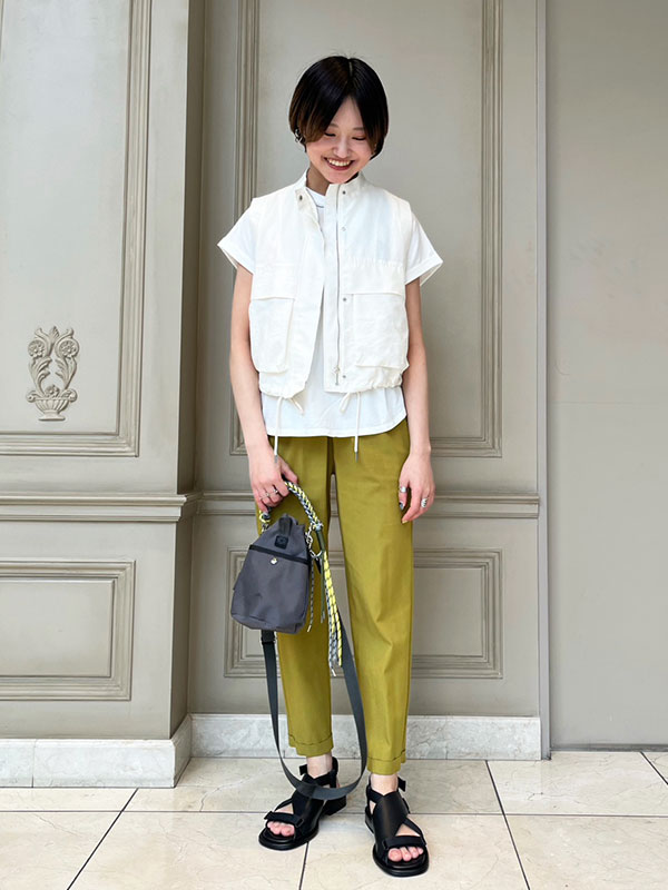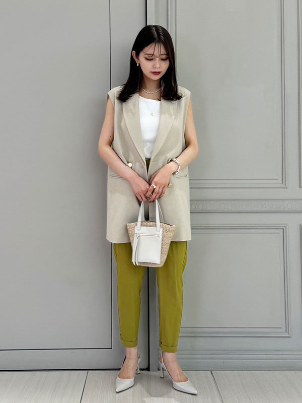 軽さのあるリネンライクのジレなら、リネン素材のカラーパンツともマッチ。