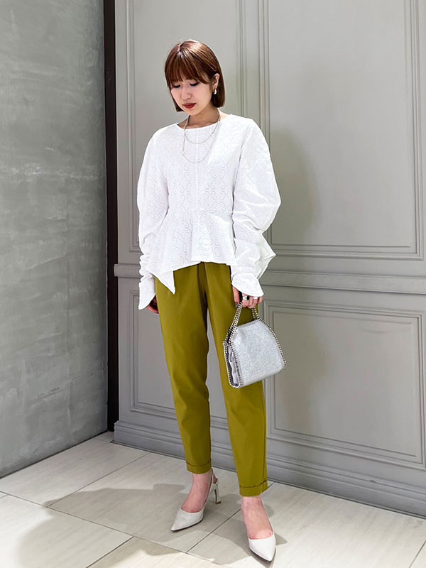 カジュアルな印象のカラーですが、レディライクな華やかトップスにヒールパンプスを合わせるとオケージョンコーデも◎!ピスタチオカラーをエレガントに着こなすにはブラックでなく”ホワイト”合わせがポイントです!