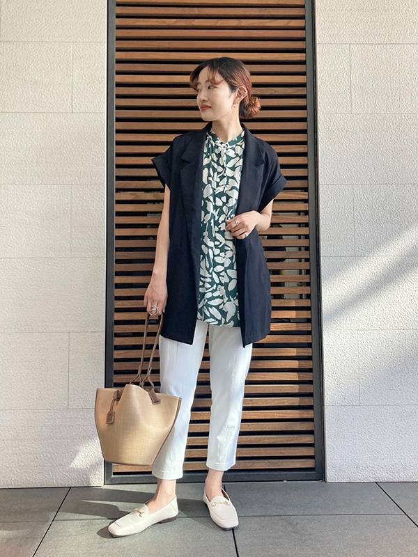 トレンドのジレと合わせた大人ハンサムコーディネート。足元も白で繋げて爽やかに。