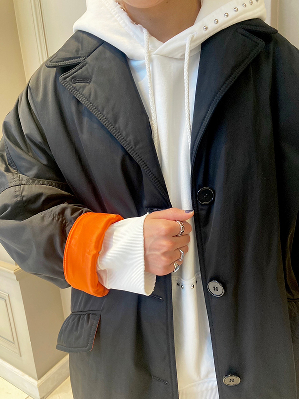 袖口のオレンジに惹きつけられる人続出!!のMM6らしいカラーリングのコート。