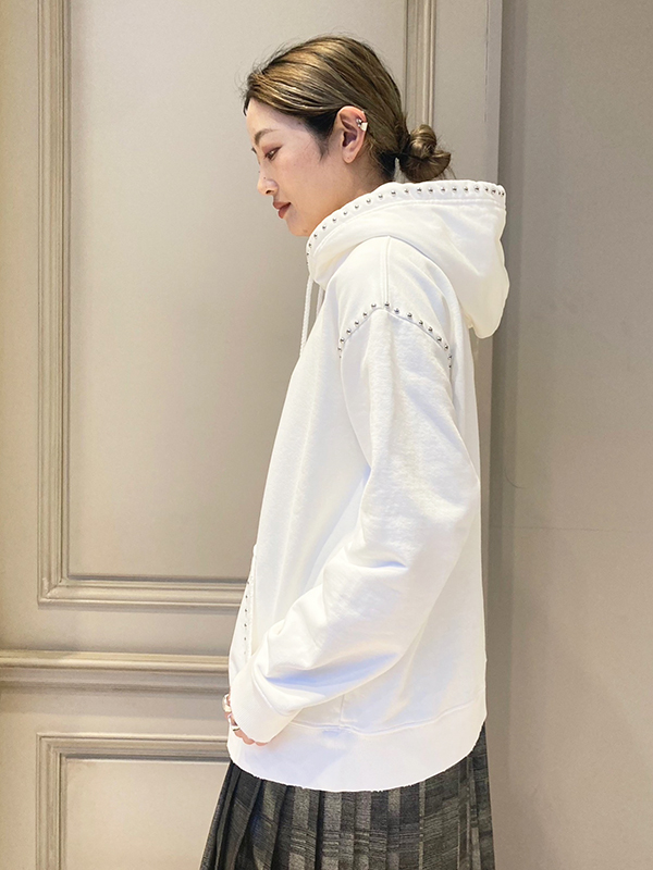 一見普通のフーディーと思いきや、着ると実感できるポイントは「スタッズの大きさと配し方」