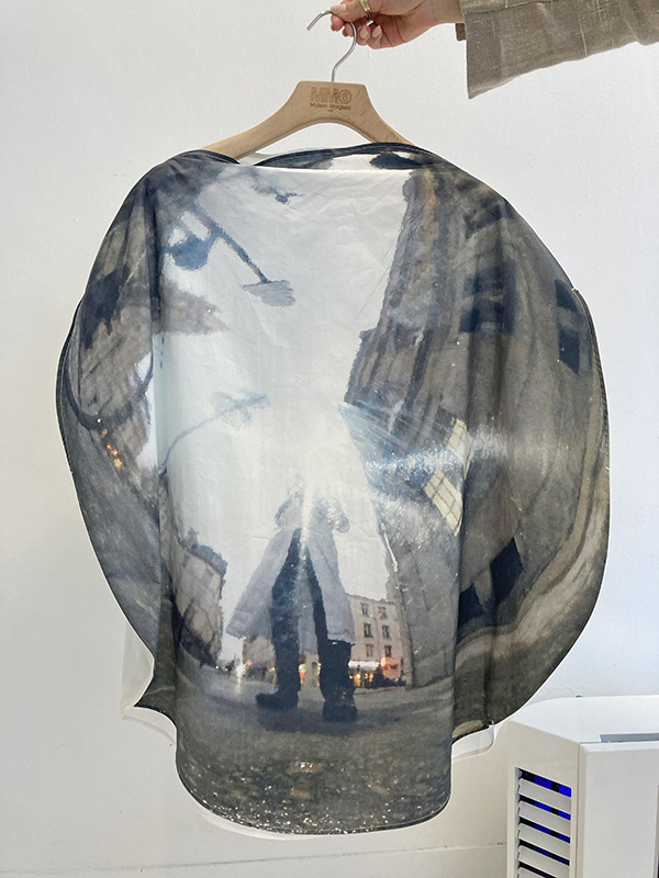 こちらは360度カメラで撮影された風景を丸いシルエットのシャツに転写プリントされています。