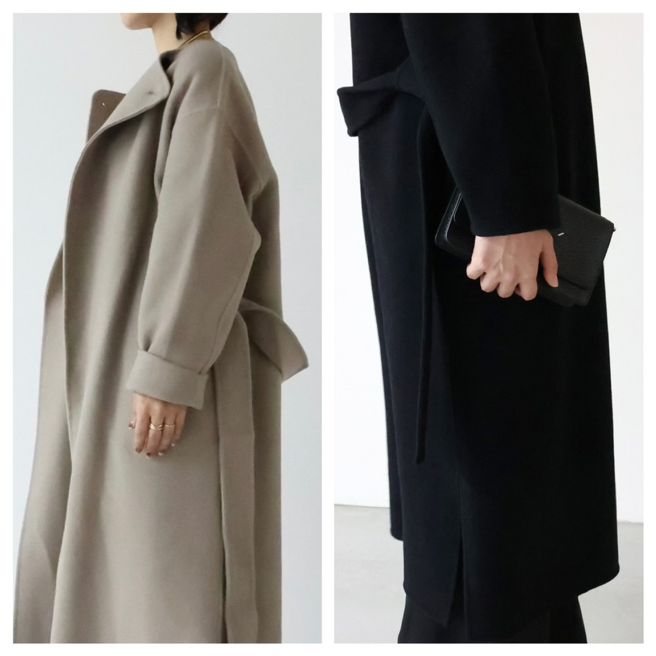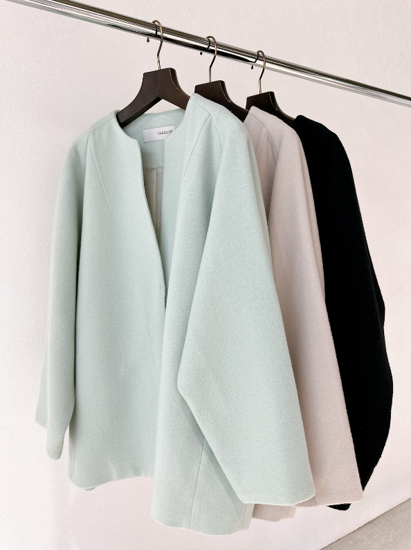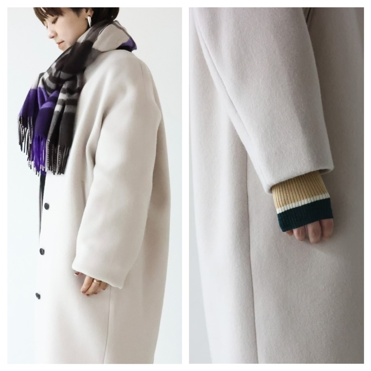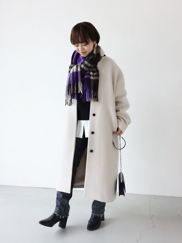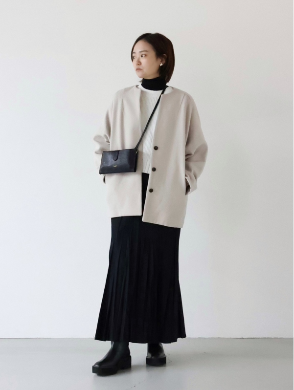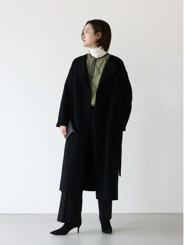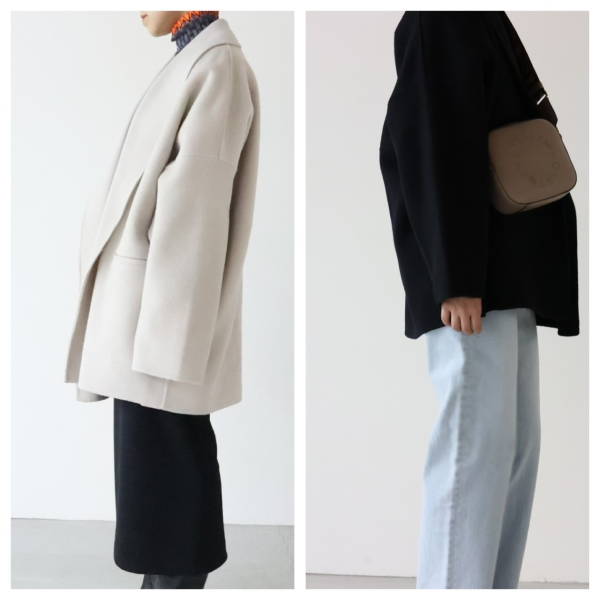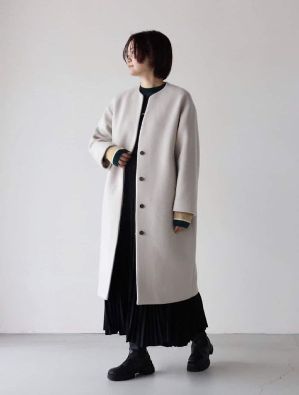 この後に紹介するPECOLAMBキーネックコートは、こちらのロングバージョン&二重織り素材となりますので、ロング派の方はそちらをチェックしてくださいね。