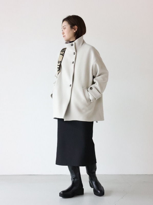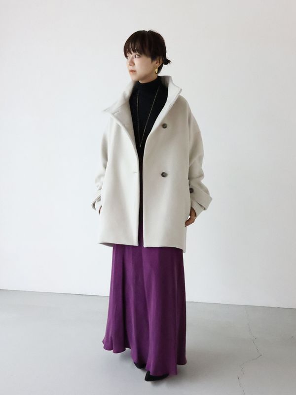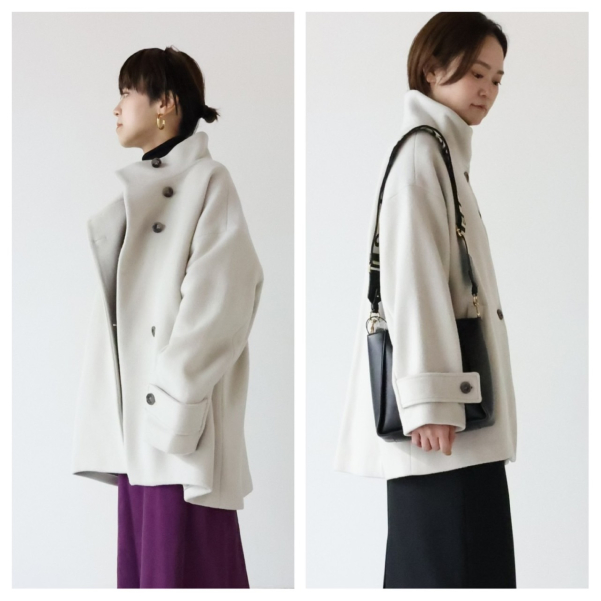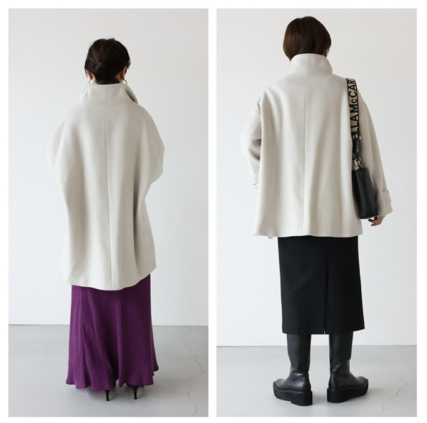 ショートコートというよりは、ミドル丈コートな感じですが、コクーンシルエットなので後姿も可愛いです!