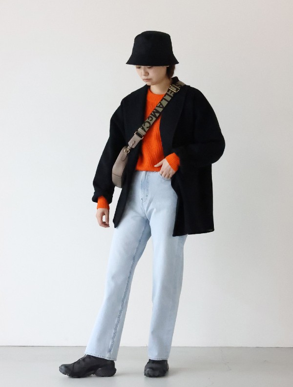今回はオレンジのニットとのレイヤードを見せたいので袖を折り返して着用しています。