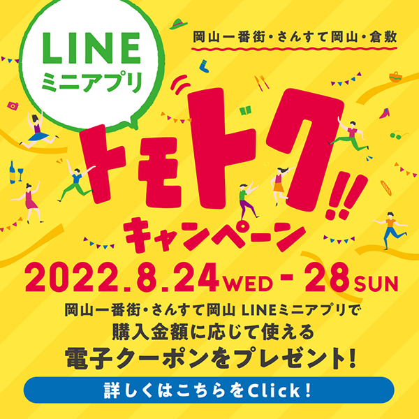 期間中に岡山一番街・さんすて岡山公式LINEをお友だち追加して頂くと、購入金額に応じて使えるお得なクーポンがご利用頂けます!