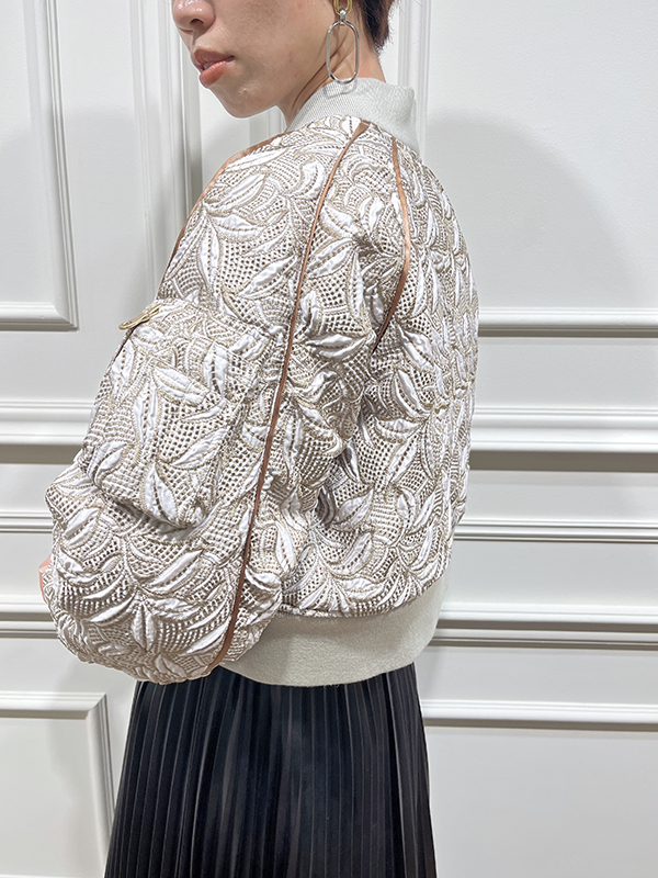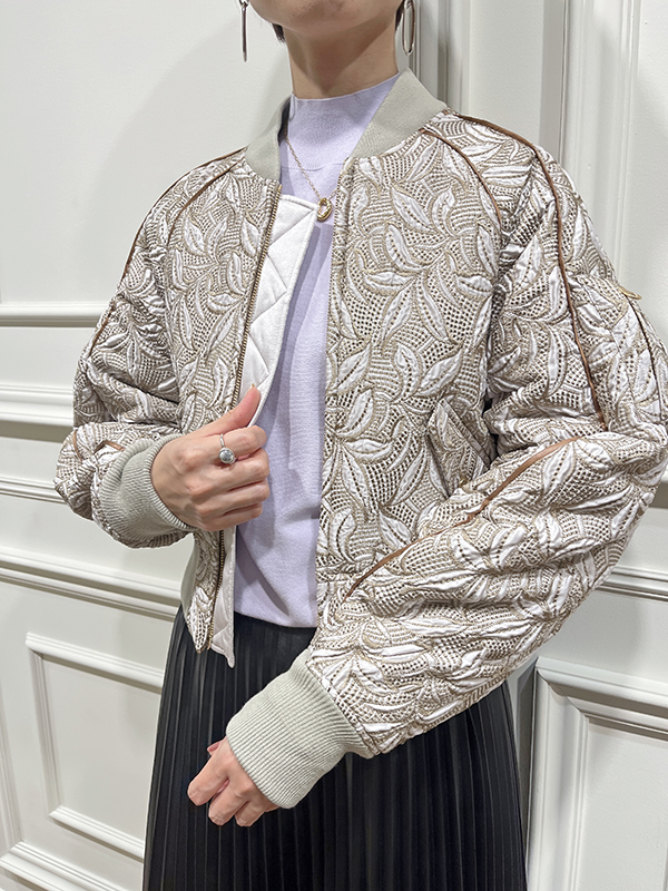 今期のテーマ” Gradation / 段階的な変化”から雪解けをイメージしデザインされたオリジナルの刺繍テキスタイルを使用したクロップド丈のフライトジャケット。