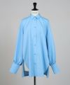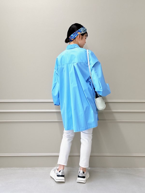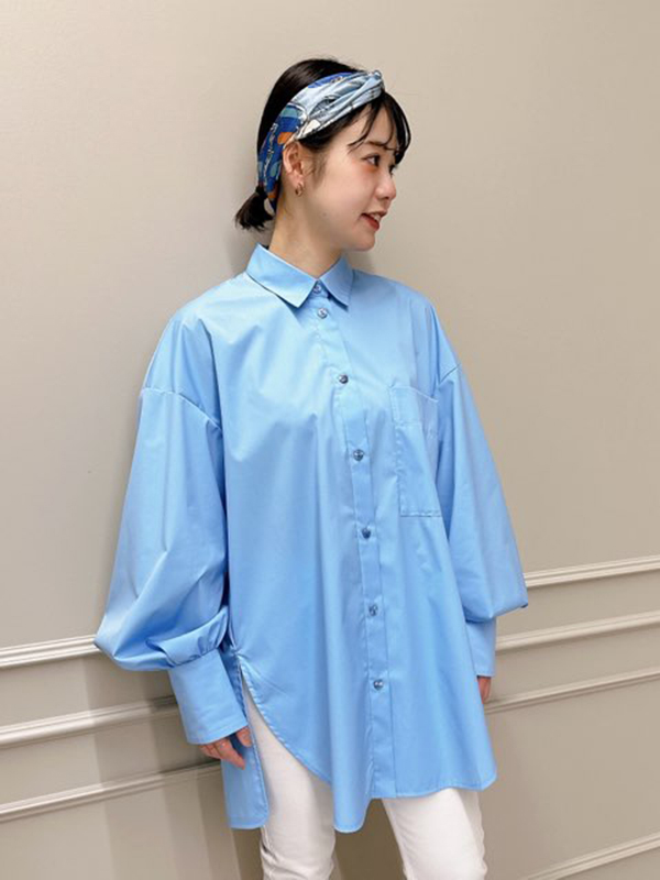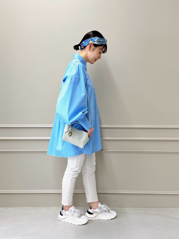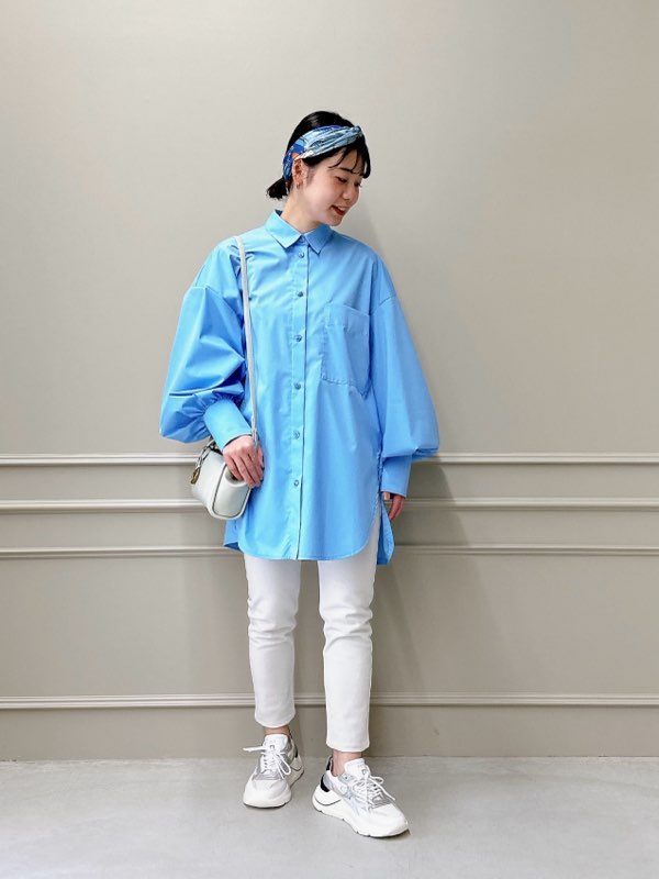 清潔感のあるブルー×ホワイトに遊び心を感じさせるボリュームシャツをチョイス◎