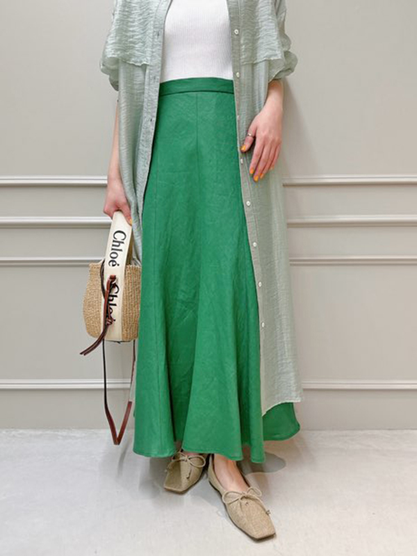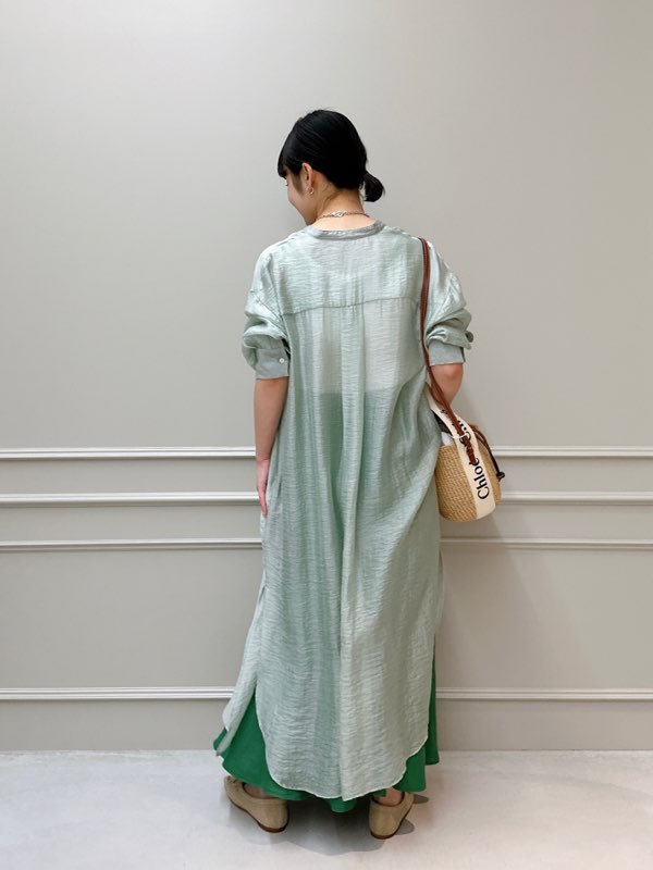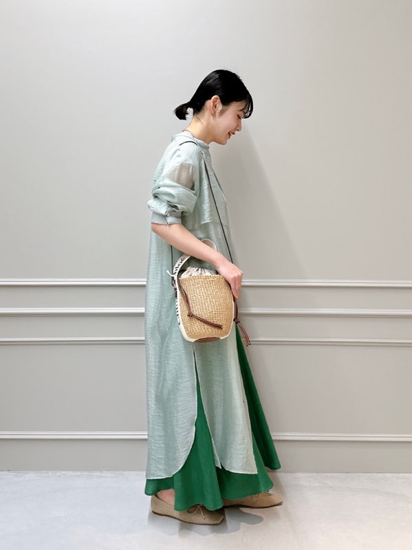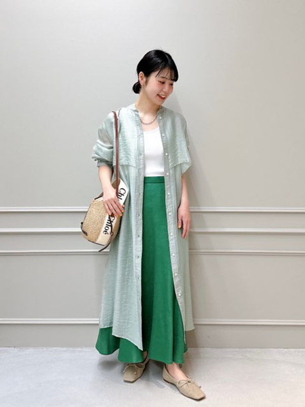 深みのあるグリーンスカートにシアー感のあるフレッシュなグリーンシャツワンピースを合わせでお洒落上級者に♪