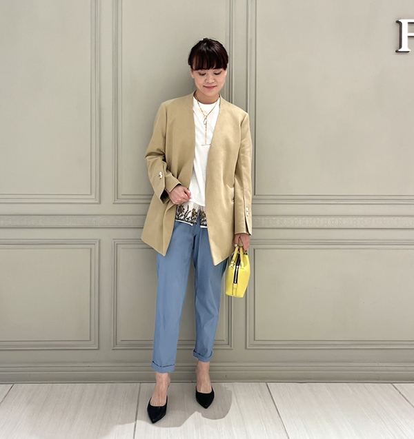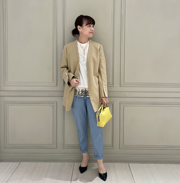 インナーに遊び心のあるデザイントップスをあわせ、肩ひじはらずに着れるシルエットと素材感も魅力的です。
