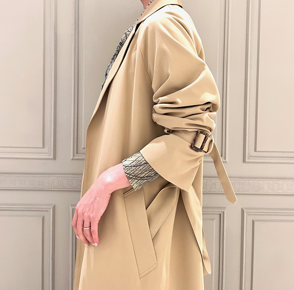 袖口もたくし上げて使用できるので、小柄な方もバランスが取りやすいため小柄な方にもおすすめトレンチコートです!(画像 中村 身長156㎝です)