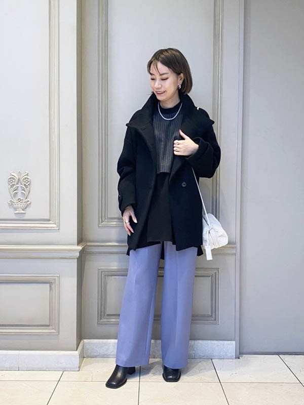 今シーズン、ブラックのコートに合わせたいのはダスティブルーのパンツ。