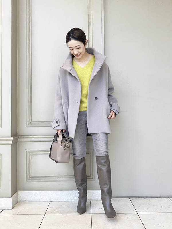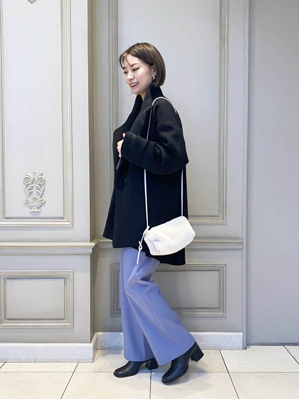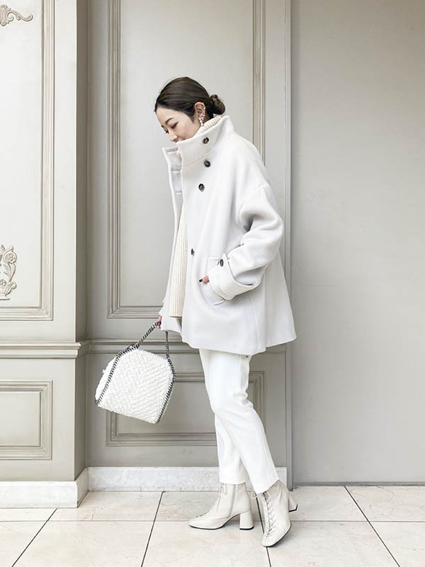 ② アイボリーのコートは、ALLニュアンスホワイトで!!異素材合わせでメリハリを。