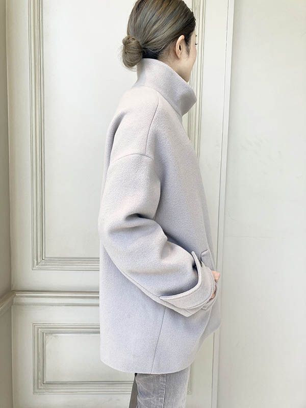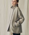 カシミヤに匹敵する繊度の羊毛スーパー140の紡毛糸を使用し、仕上げに高級起毛仕上げシャルム加工を施した高級感のある素材のスタンドカラーコート。