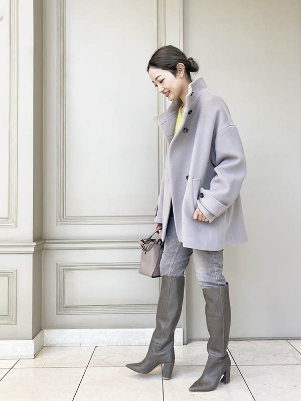 モカのニュアンスに馴染むボトムをチョイスし、ロングブーツで今年仕様にアップデート!!