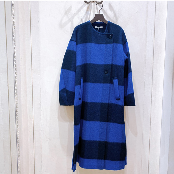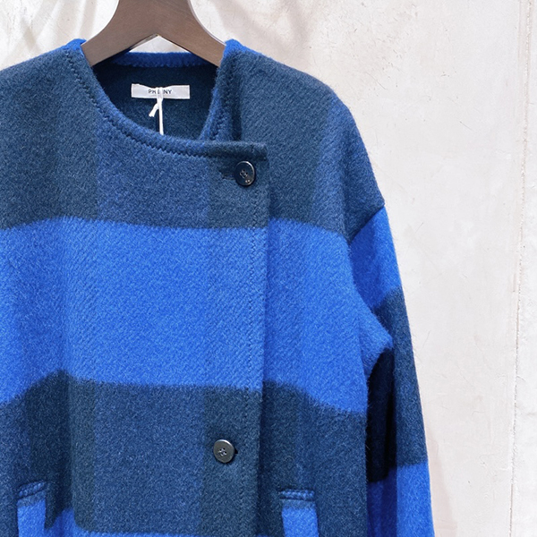 ブルーのチェック柄コートです。